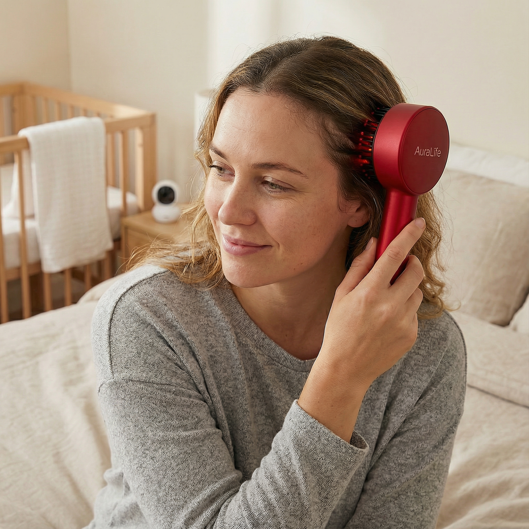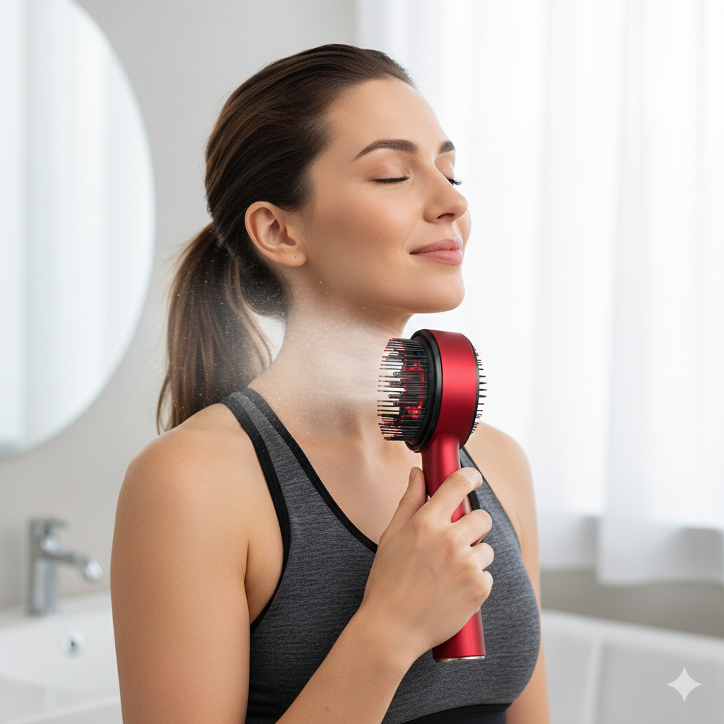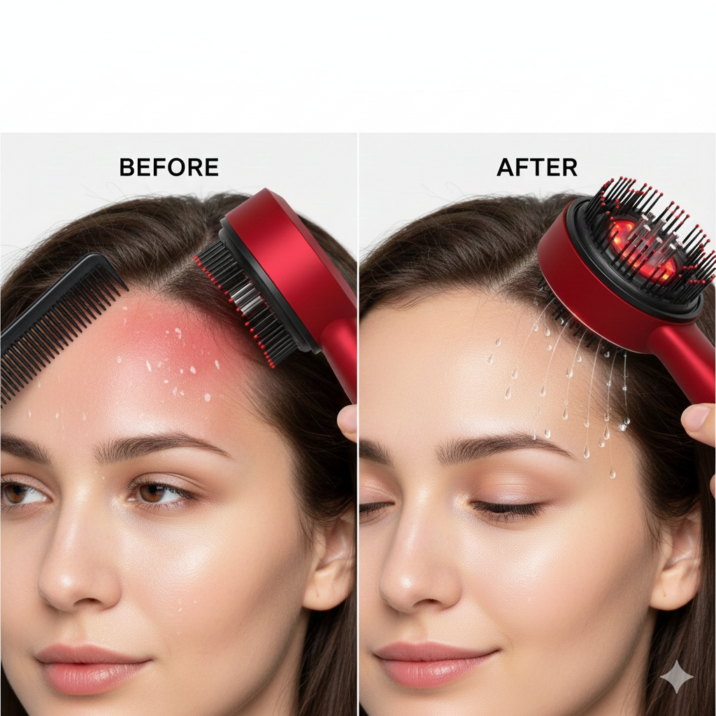 Gentle kneading + vibration loosens tension and helps calm stress-induced shedding.